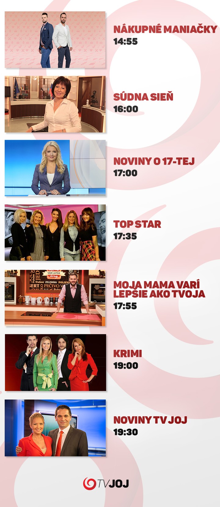 Premiérové časti Súdnej siene sa na JOJku vracajú v úplne novom vysielacom čase a vy si nové príbehy budete môcť pozrieť o 16:00. V súvislosti s tým sa upravil vysielací čas aj pri iných televíznych formátoch. Najštýlovejšiu šou Nákupné maniačky si v premiére môžete pozrieť o 14:55 a novinky zo sveta šoubiznisu vám prinesie Top Star o 17:35. Do vysielacej štruktúry už neodmysliteľne patria Noviny o 17-tej, kuchárska šou Moja mama varí lepšie ako tvoja, Krimi a Noviny, ktoré budeme vysielať v nezmenenom čase. Pre lepšiu prehľadnosť sme pre vás spravili aj názorný televízny program, aby ste vedeli, kedy na JOJke nájdete svoje obľúbené relácie.