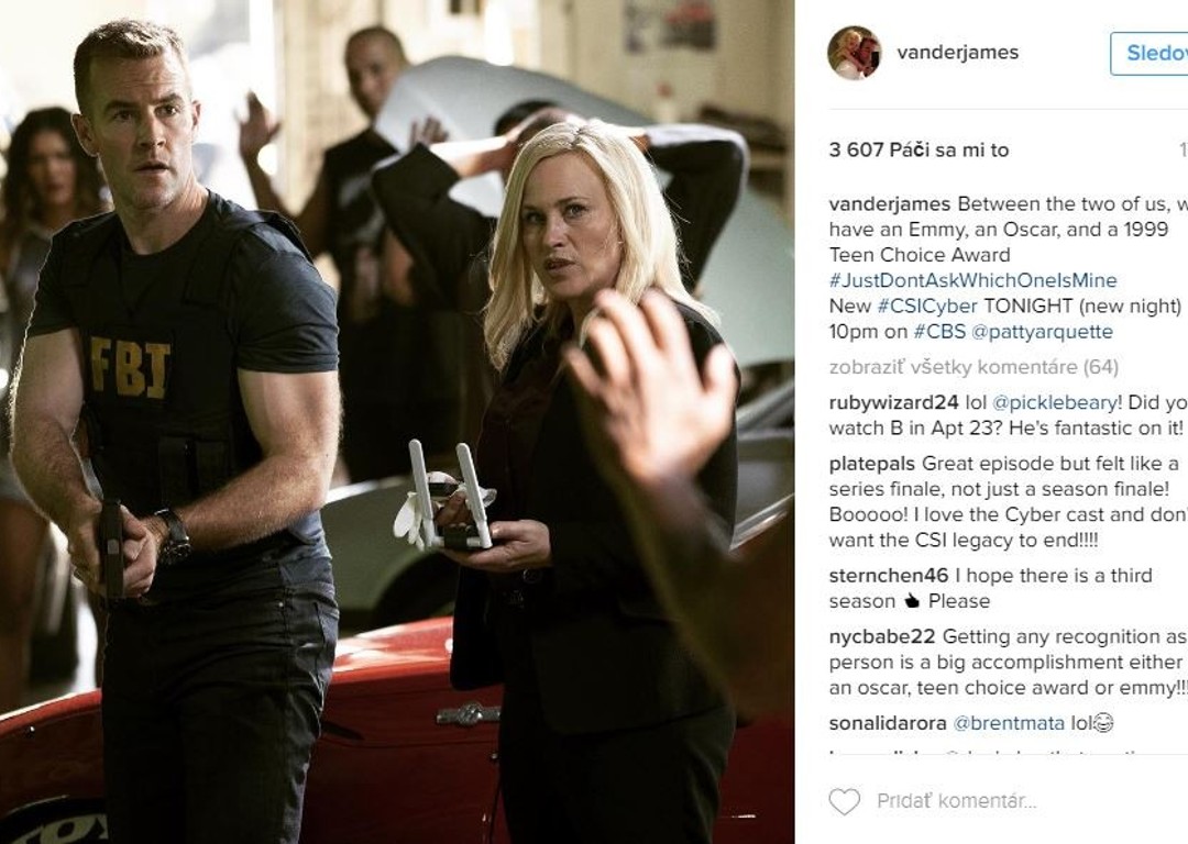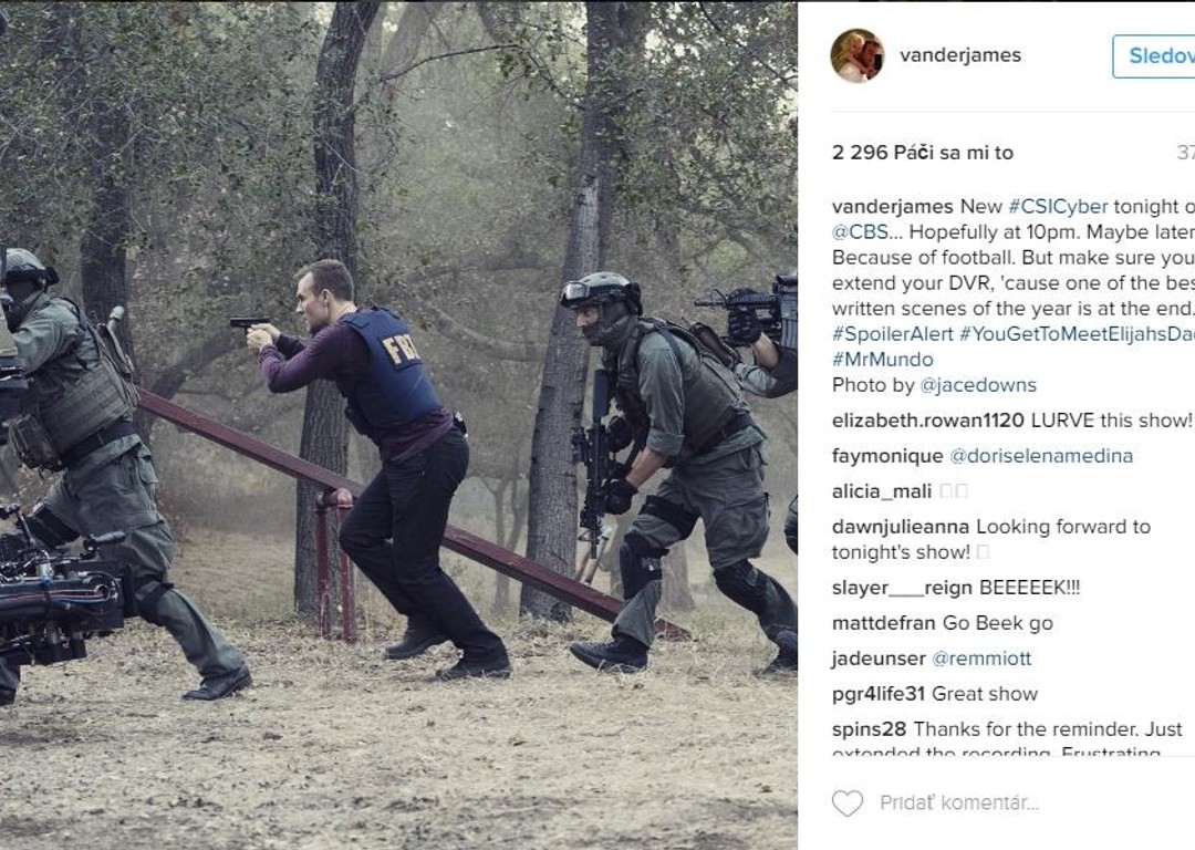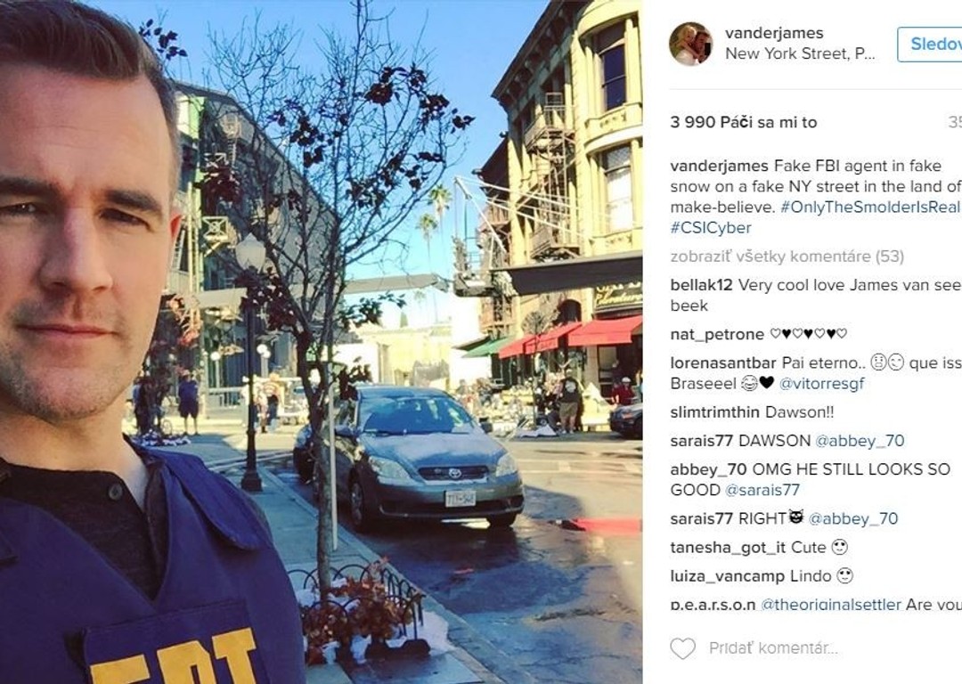 James Van Der Beek, ktorý sa do pamäte divákov zapísal najmä ako hlavný hrdina tínedžerského televízneho seriálu Dawnsnov svet sa rád pýši nielen svojou veľkou rodinkou, ale aj zákulisnými fotografiami. Svoj instagram zahlcuje momentkami z nakrúcania seriálu C.S.I. Cyber, ktorý od dnes môžete sledovať aj na našej JOJke. Ako drsný policajt Elijah Mundo sa do tohto seriálu zamiloval natoľko, že sa chce o zákulisie podeliť aj so svojimi fanúšikmi. O akčné scény nie je núdza a on sa v nich očividne vyžíva. Snímky z auta, so zbraňou, porada s režisérom, či ukážka z falošných vonkajších priestorov, to všetko James ukazuje na svojom účte. Z týchto fotiek môžeme usúdiť, že sa máme na čo tešiť a nový seriál by ste si nemali nechať ujsť.