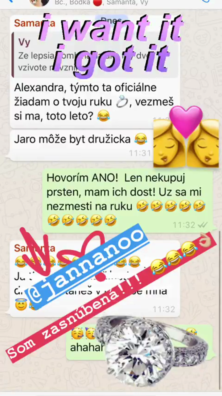 Alexandra Orviská je moderátorkou obľúbenej relácie TopStar a známa je napríklad aj tým, že má k móde naozaj blízko. Vždy sa rada pekne a štýlovo obliekala a mala výborný vkus. Aj vďaka jej skvelej postave, krásnej tvári a sexi vyžarovaniu sa z nej stala hotová módna ikona. Na svojom instagramovom profile je aj vďaka fotkám s dokonalými outfitmi veľkou inšpiráciou pre mnohé dámy. Niet divu, že ju na tejto sociálnej sieti sleduje už neuveriteľných 80 tisíc ľudí. Desaťtisíce fanúšikov boli nedávno svedkami nečakanej správy. Saša totiž zverejnila fotografiu z konverzácie so svojou blízkou priateľkou. Tá ju v rámci ich spoločnej debaty nečakane "požiadala o ruku": "Alexandra, týmto ťa oficiálne žiadam o ruku. Vezmeš si ma, toto leto?" Sympatická moderátorka neváhala a kamarátke adresovala kladnú odpoveď. "Hovorím áno! Len nekupuj prsteň, mám ich dosť. Už sa mi ani nezmestí na ruku," vtipne odpovedala Saša, ktorá tak konečne dostala to, po čom jej srdce túžilo.