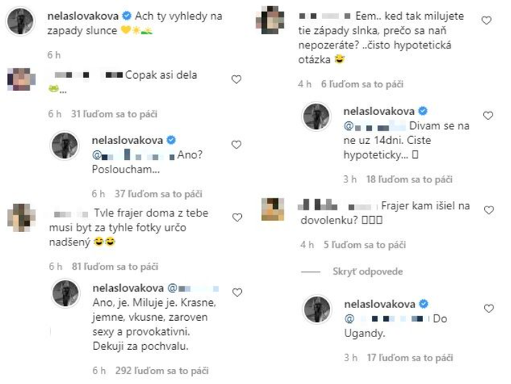 Sociálne siete nie sú len plné toho pekného, ale nájdu sa aj kritici, ktorí po negatívne slová nechodia ďaleko. Nela Slováková preto urobila krok, vďaka ktorému takzvaných hejterov "odstrihla". Jej fotografie najnovšie môžu komentovať len ľudia, ktorí ju sledujú. Pri poslednom zábere jej to ale aj tak nepomohlo, pretože jej fanúšikovia ju zahrnuli logickými postrehmi a kritikou. "Ach, tie výhľady na západy slnka," napísala blondínka k fotke, ktorej dominuje jej nahé telo a za ním sa vyníma obloha na Maldivoch. Netrvalo dlho a začali sa na ňu sypať negatívne reakcie. Nela, hoci je na dovolenke, sa rozhodla na všetky osobitne odpovedať. Určite tak mala postarané o program.