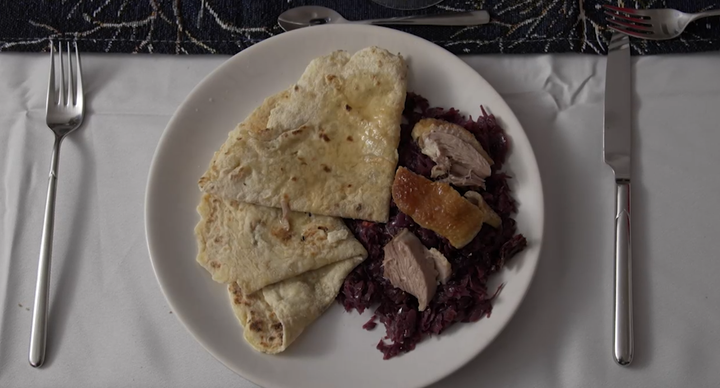 Do pekáča dáme umyté a dobre nasolené kačacie prsia. Podlejeme ich vodou a olejom a necháme piecť, pokiaľ sa neupečú. do hrnca dáme olej a cukor a spravíme karamel. Pridáme cibuľu a červenú kapustu. Osolíme, okoreníme, zalejeme troškou vody a necháme variť, kým sa voda nevyparí. Uvarené zemiaky nastrúhame najemno, pridáme múku a štipku soli. A vypracujeme cesto. Vyvaľkané lokše opekáme na suchej panvici bez oleja, po opečení lokše potrieme výpekom z kačky.